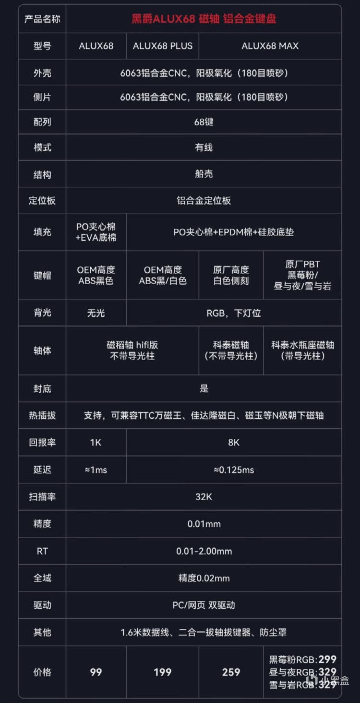 这把键盘最大的亮点是?正如前言所道,99元的全铝合金磁轴键盘版本,是Alux68最大的亮点,也是其杀死比赛的关键要素。